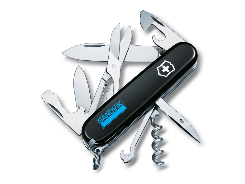Швейцарский армейский нож Victorinox Climber из нержавеющей стали. Включает 14 функций: большое лезвие, малое лезвие, штопор, консервный нож, шило, кернер, кольцо для ключей, пинцет, зубочистка, ножницы, многофункциональный крючок.