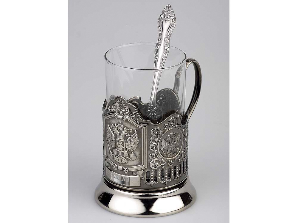 Комплект из стекляного стакана, ложки из нержавеющей стали и подстаканника из никелерованной латуни. Весь комплект уложен в подарочную коробку. На подстаканнике выгравирован логотип Sandvik и герб России.